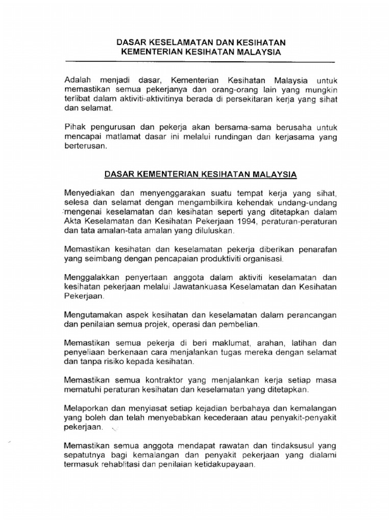 Dasar Kementerian Kesihatan Malaysia Menyediakan dan menyenggarakan suatu tempat kerja yang sihat selesa dan selamat dengan mengambilkira kehendak undang-undang mengenai keselamatan dan kesihatan seperti yang ditetapkan dalam Akta Keselamatan dan Kesihatan Pekerjaan 1994. Cara buat polisi keselamatan dan kesihatan pekerjaan di tempat kerja. Sejajar dengan peruntukan Seksyen 16 Akta Keselamatan dan Kesihatan Pekerjaan 1994 Akta 514 maka dengan ini dinyatakan Dasar Keselamatan dan Kesihatan iaitu.